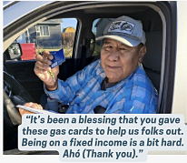 This program provides gas gift cards for cancer and dialysis patients who travel off the reservation for doctors’ appointments and treatments. Program participants work with a staff member to create a transportation plan that works best for them. Staff members distribute gas cards based on the needs of each participant. In 2024, we helped 67 cancer and dialysis patients and provided over $52,000 in gas cards.