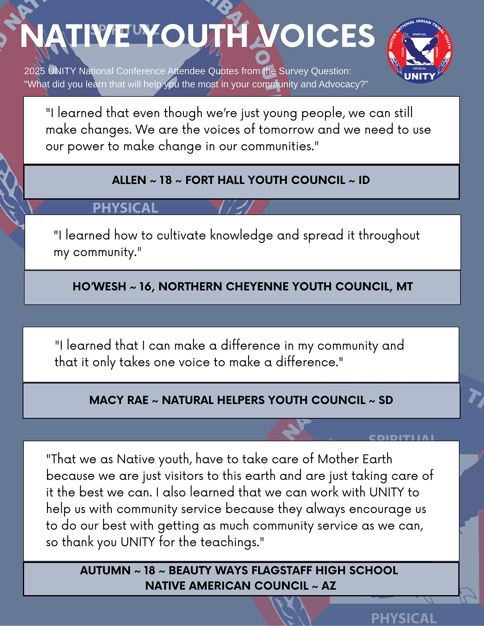 Where: Youth participants from Tribal communities across the country will gather at UNITY’s national gatherings for leadership development, cultural connection, and community building.